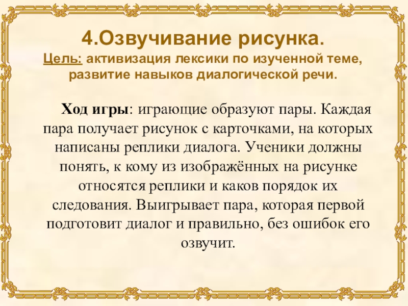 получает рисунок с карточками, на которых написаны реплики диалога. Ученики должны понять, к кому из изображённых на рисунке относятся реплики и каков порядок их следования. Выигрывает пара, которая первой подготовит диалог и правильно, без ошибок его озвучит.