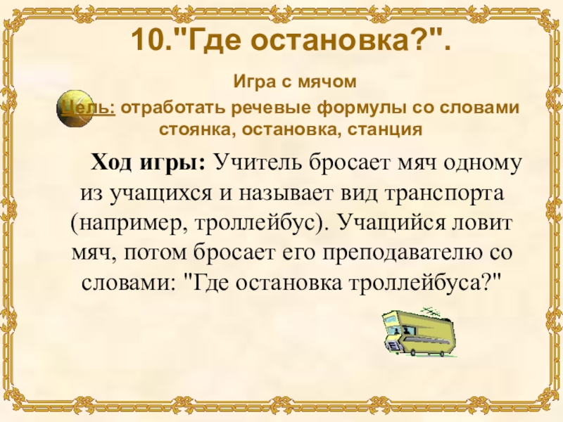 Ход игры: Учитель бросает мяч одному из учащихся и называет вид транспорта (например, троллейбус). Учащийся ловит мяч, потом бросает его преподавателю со словами: "Где остановка троллейбуса?"