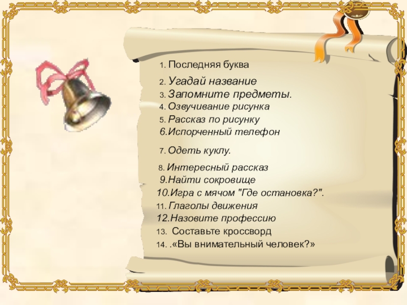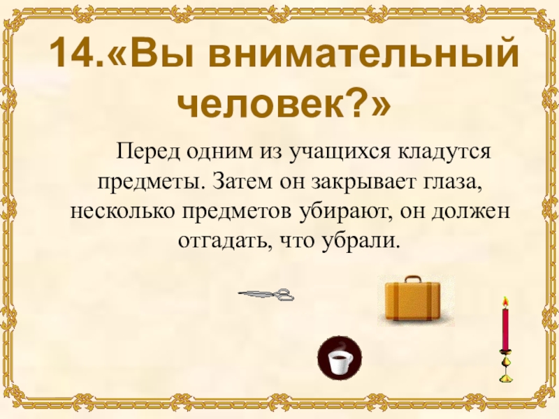 предметы. Затем он закрывает глаза, несколько предметов убирают, он должен отгадать, что убрали.