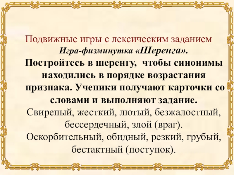 Постройтесь в шеренгу, чтобы синонимы находились в порядке возрастания признака.