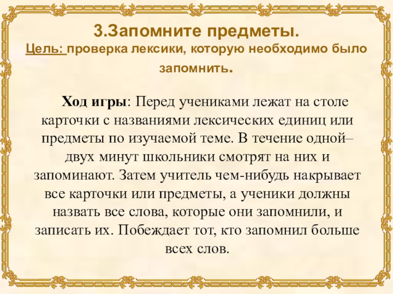 Ход игры: Перед учениками лежат на столе карточки с названиями лексических единиц или предметы по изучаемой теме. В течение одной–двух минут школьники смотрят на них и запоминают. Затем учитель чем-нибудь накрывает все карточки или предметы, а ученики должны назвать все слова, которые они запомнили, и записать их. Побеждает тот, кто запомнил больше всех слов.