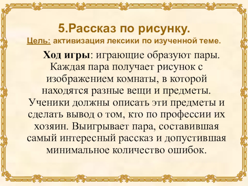 игры: играющие образуют пары. Каждая пара получает рисунок с изображением комнаты, в которой находятся разные вещи и предметы. Ученики должны описать эти предметы и сделать вывод о том, кто по профессии их хозяин. Выигрывает пара, составившая самый интересный рассказ и допустившая минимальное количество ошибок.