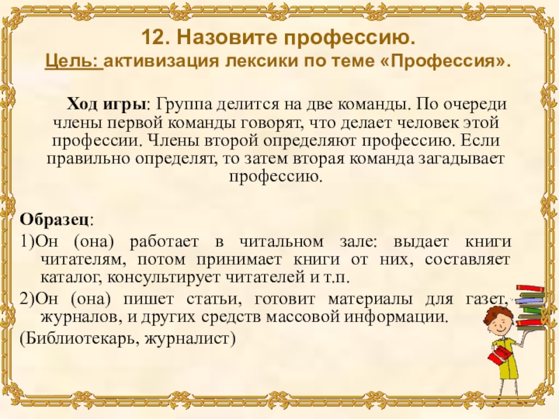 игры: Группа делится на две команды. По очереди члены первой команды говорят, что делает человек этой профессии. Члены второй определяют профессию. Если правильно определят, то затем вторая команда загадывает профессию.