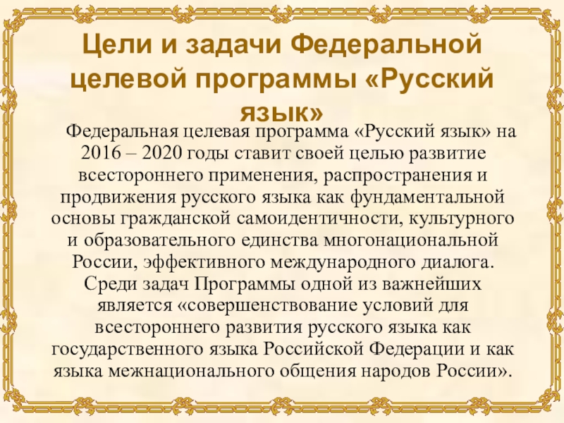 Федеральная целевая программа «Русский язык» на 2016 – 2020 годы ставит своей целью развитие всестороннего применения, распространения и продвижения русского языка как фундаментальной основы гражданской самоидентичности, культурного и образовательного единства многонациональной России, эффективного международного диалога. Среди задач Программы одной из важнейших является «совершенствование условий для всестороннего развития русского языка как государственного языка Российской Федерации и как языка межнационального общения народов России».