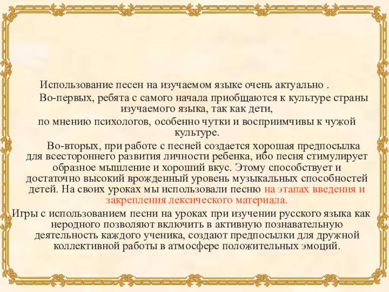 Во-вторых, при работе с песней создается хорошая предпосылка для всестороннего развития личности ребенка, ибо песня стимулирует образное мышление и хороший вкус. Этому способствует и достаточно высокий врожденный уровень музыкальных способностей детей. На своих уроках мы использовали песню на этапах введения и закрепления лексического материала.