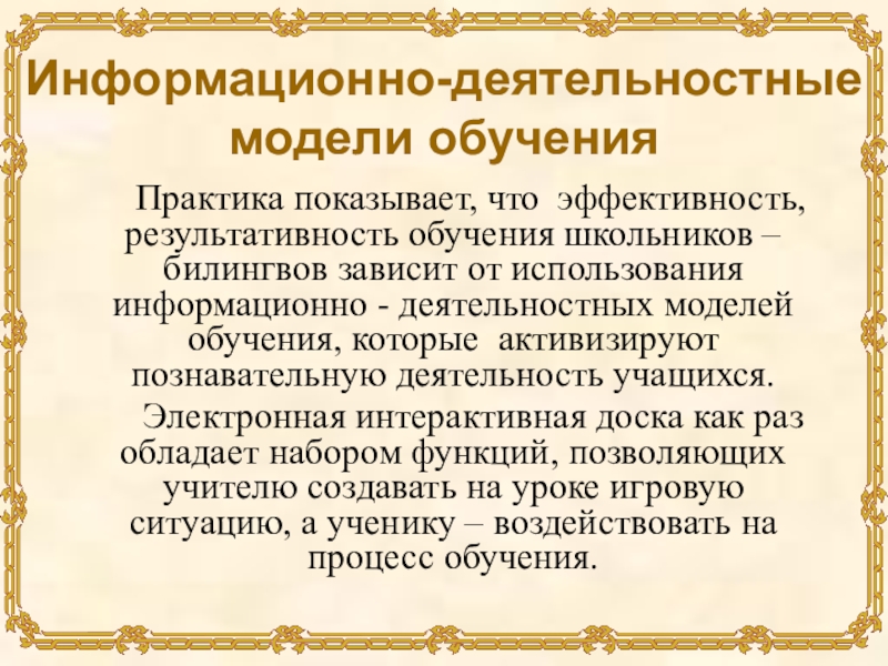 результативность обучения школьников – билингвов зависит от использования информационно - деятельностных моделей обучения, которые активизируют познавательную деятельность учащихся.