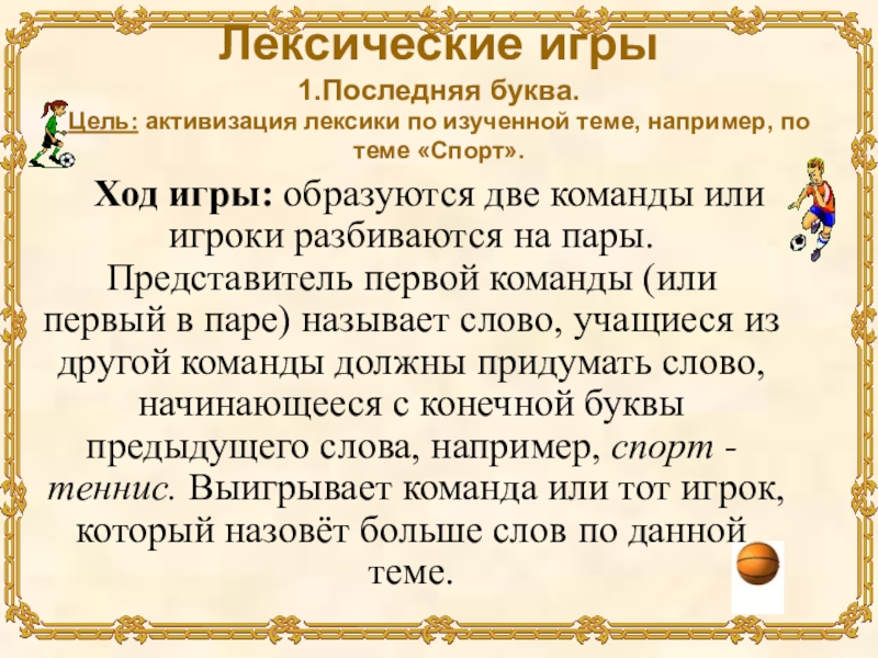 Ход игры: образуются две команды или игроки разбиваются на пары. Представитель первой команды (или первый в паре) называет слово, учащиеся из другой команды должны придумать слово, начинающееся с конечной буквы предыдущего слова, например, спорт - теннис. Выигрывает команда или тот игрок, который назовёт больше слов по данной теме.