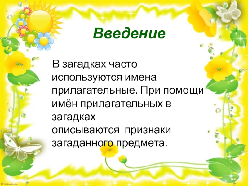 прилагательных. можно легко составить загадку самому. Благодаря прилагательным , мы представляем предмет, про который нам говорят.