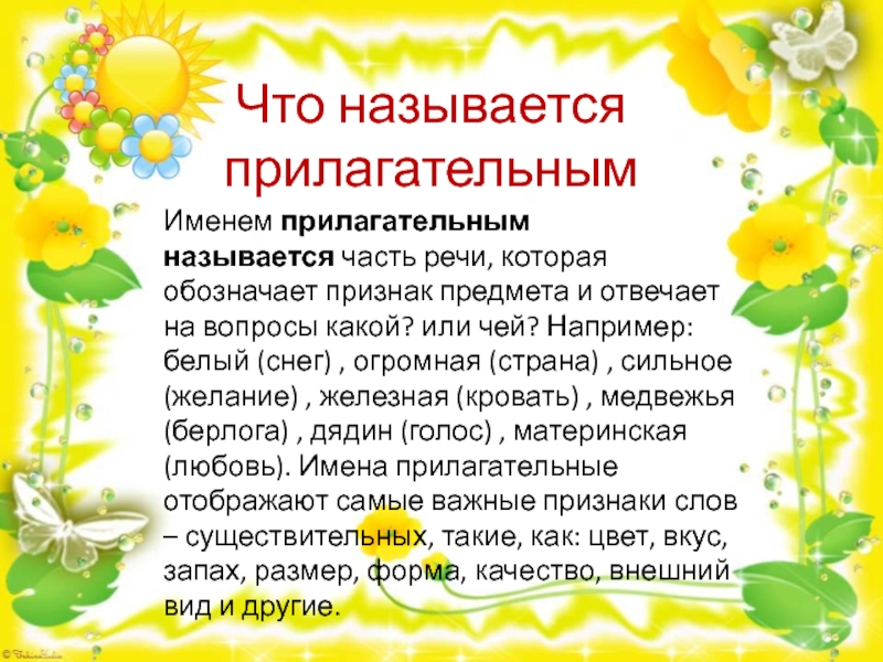 предмета и отвечает на вопросы какой? или чей? Например: белый (снег) , огромная (страна) , сильное (желание) , железная (кровать) , медвежья (берлога) , дядин (голос) , материнская (любовь). Имена прилагательные отображают самые важные признаки слов – существительных, такие, как: цвет, вкус, запах, размер, форма, качество, внешний вид и другие.