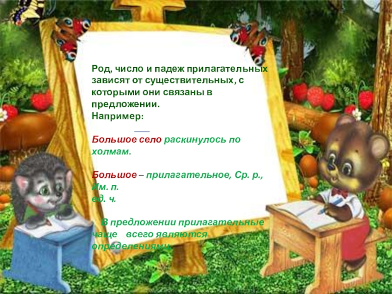 Медведь ( какой?) задумчивый, бочка ( какая?) деревянная, настроение (какое?) грустное, берёзы ( какие?) белые.
