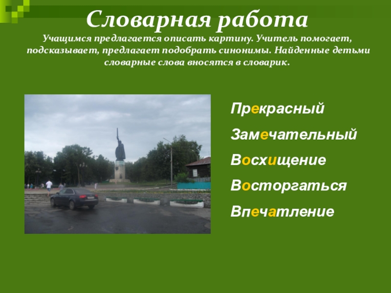 Учащимся предлагается описать картину. Учитель помогает, подсказывает, предлагает подобрать синонимы.