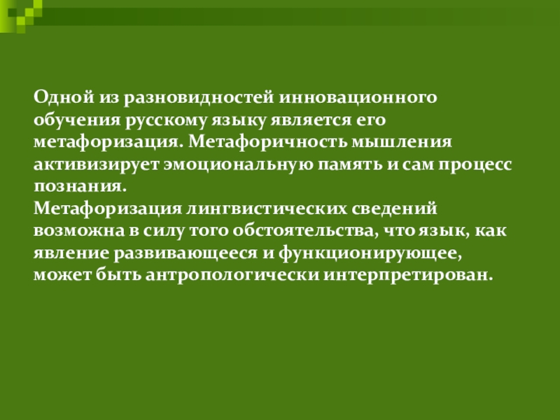 Слайд 3Одной из разновидностей инновационного обучения русскому языку является его метафоризация. Метафоричность