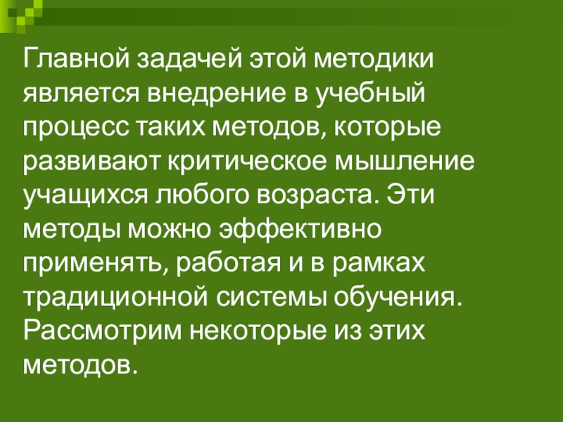 Слайд 6Главной задачей этой методики является внедрение в учебный процесс таких методов,