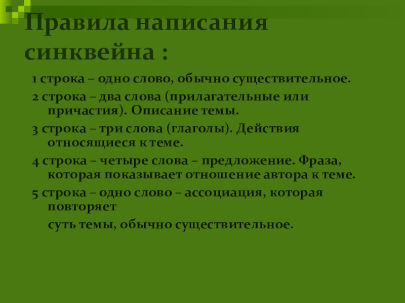 4 строка – четыре слова – предложение. Фраза, которая показывает отношение автора к теме.