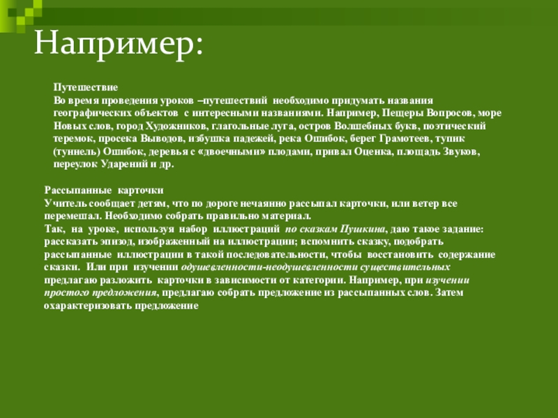 интересными названиями. Например, Пещеры Вопросов, море Новых слов, город Художников, глагольные луга, остров Волшебных букв, поэтический теремок, просека Выводов, избушка падежей, река Ошибок, берег Грамотеев, тупик (туннель) Ошибок, деревья с «двоечными» плодами, привал Оценка, площадь Звуков, переулок Ударений и др.