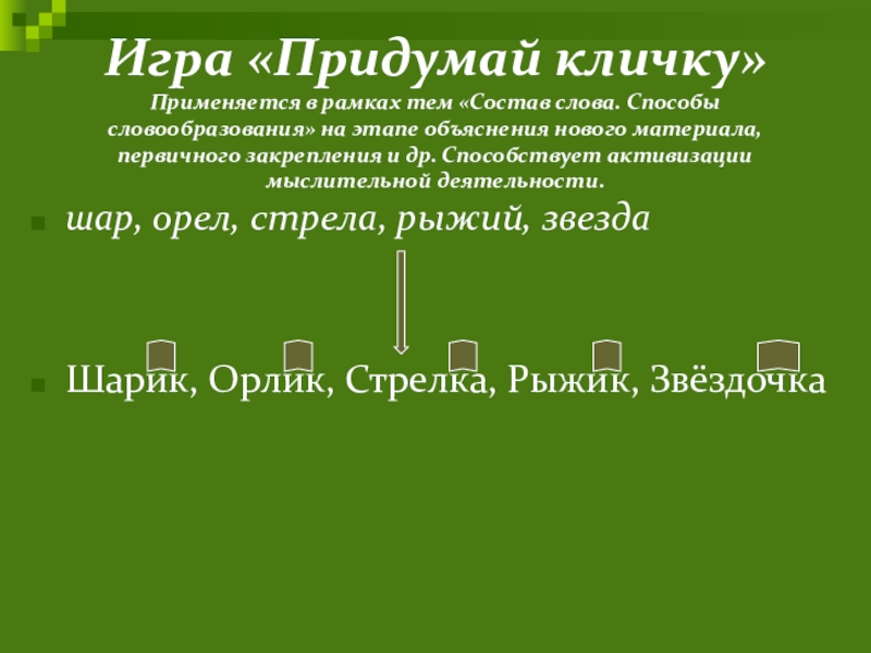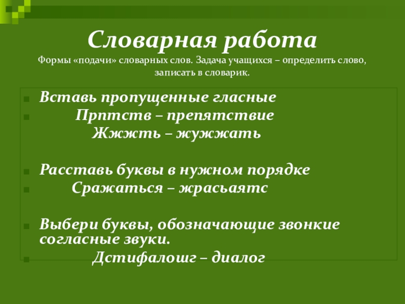 Формы «подачи» словарных слов. Задача учащихся – определить слово,