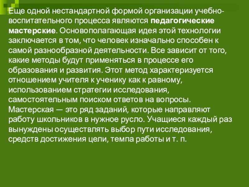Слайд 4Еще одной нестандартной формой организации учебно-воспитательного процесса являются педагогические мастерские. Основополагающая