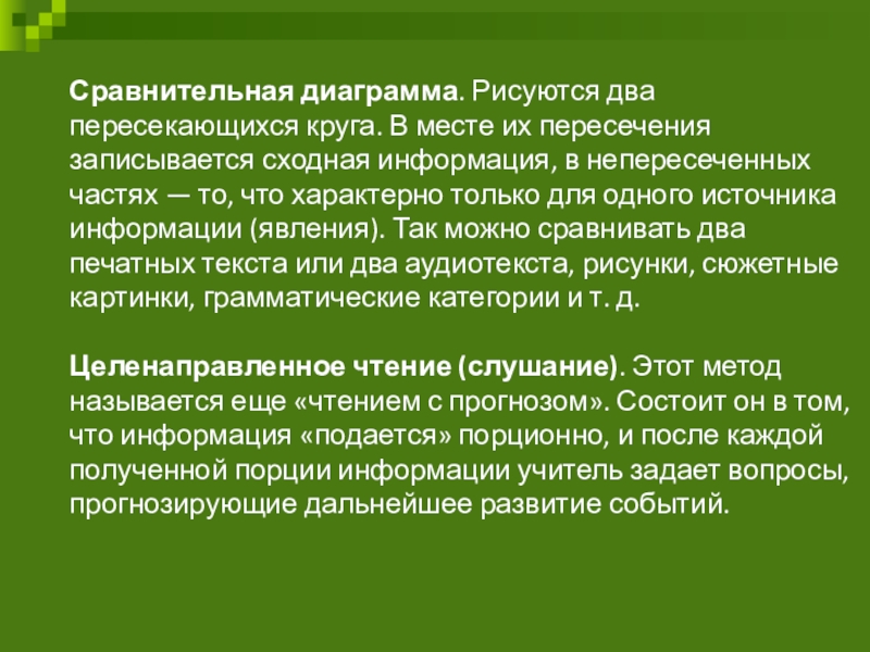 Целенаправленное чтение (слушание). Этот метод называется еще «чтением с прогнозом». Состоит он в том, что информация «подается» порционно, и после каждой полученной порции информации учитель задает вопросы, прогнозирующие дальнейшее развитие событий.