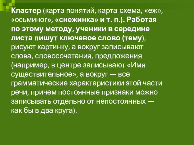 по этому методу, ученики в середине листа пишут ключевое слово (тему), рисуют картинку, а вокруг записывают слова, словосочетания, предложения (например, в центре записывают «Имя существительное», а вокруг — все грамматические характеристики этой части речи, причем постоянные признаки можно записывать отдельно от непостоянных — как бы в два круга).