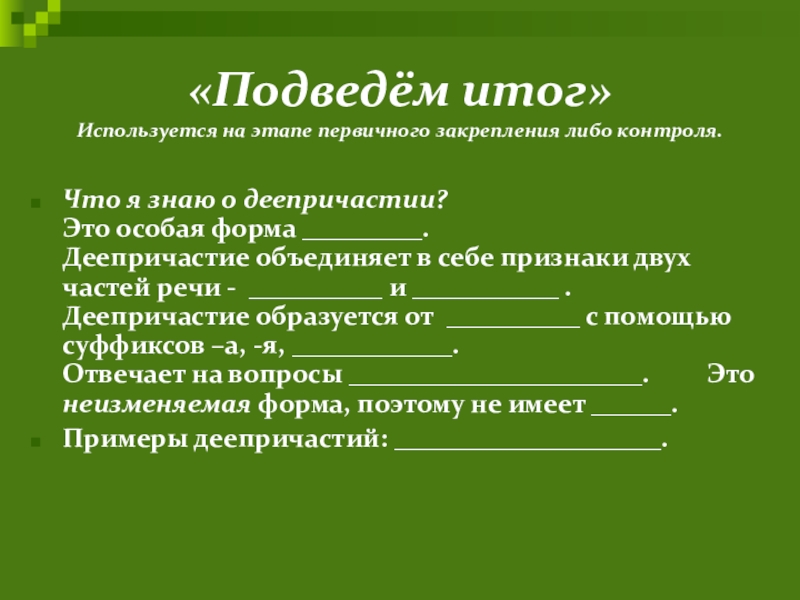 о деепричастии? Это особая форма _________. Деепричастие объединяет в себе признаки двух частей речи - __________ и ___________ . Деепричастие образуется от __________ с помощью суффиксов –а, -я, ____________. Отвечает на вопросы ______________________. Это неизменяемая форма, поэтому не имеет ______.