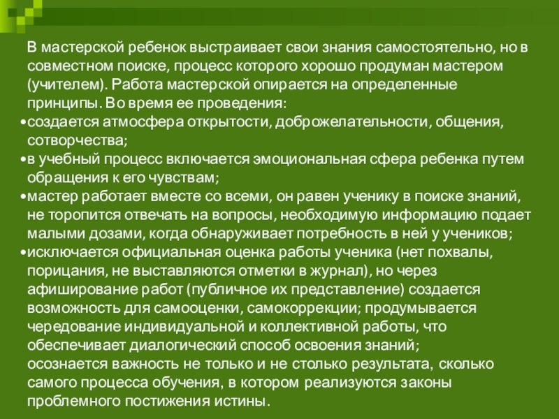 процесс которого хорошо продуман мастером (учителем). Работа мастерской опирается на определенные принципы. Во время ее проведения: