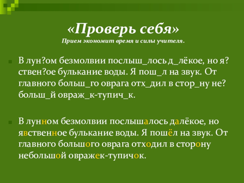 но я?ствен?ое булькание воды. Я пош_л на звук. От главного больш_го оврага отх_дил в стор_ну не?больш_й овраж_к-тупич_к.