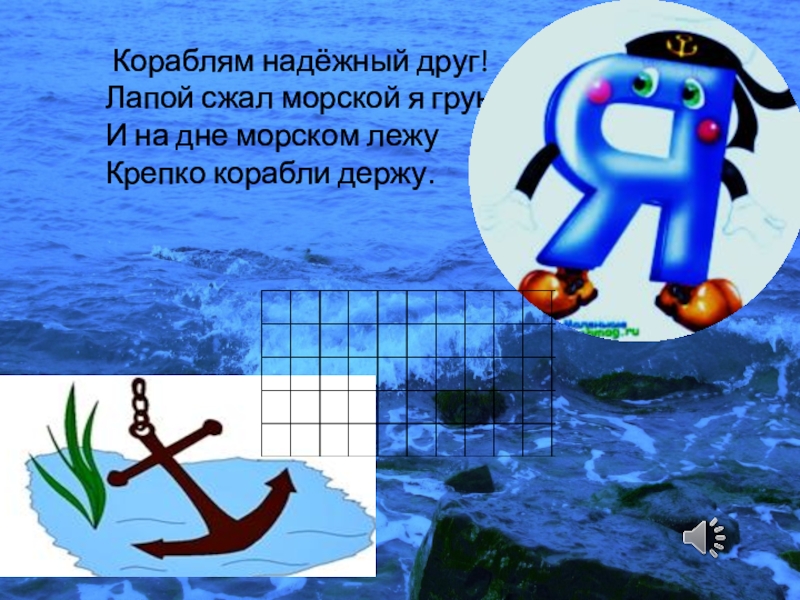 Кораблям надёжный друг!Лапой сжал морской я грунт.И на дне морском лежуКрепко корабли держу.