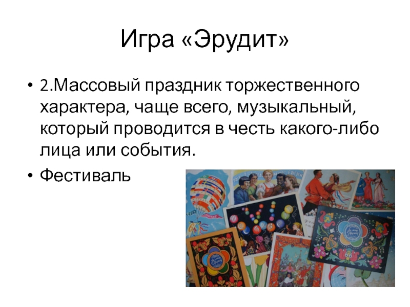 2.Массовый праздник торжественного характера, чаще всего, музыкальный, который проводится в