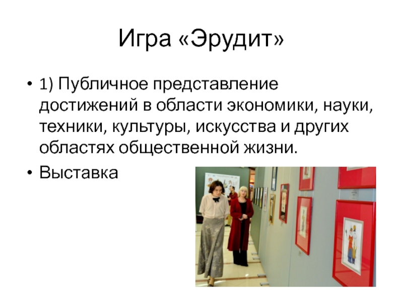 1) Публичное представление достижений в области экономики, науки, техники, культуры,