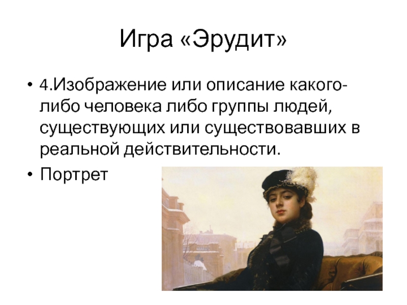 4.Изображение или описание какого-либо человека либо группы людей, существующих или