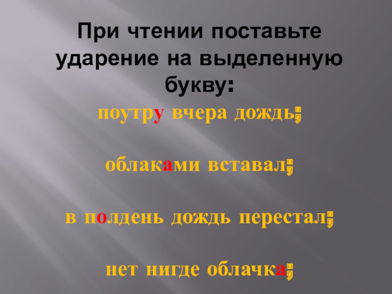 Слайд 6При чтении поставьте ударение на выделенную букву: поутру вчера дождь; облаками вставал; в полдень