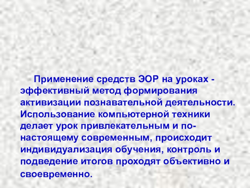эффективный метод формирования активизации познавательной деятельности. Использование компьютерной техники делает урок привлекательным и по-настоящему современным, происходит индивидуализация обучения, контроль и подведение итогов проходят объективно и своевременно.