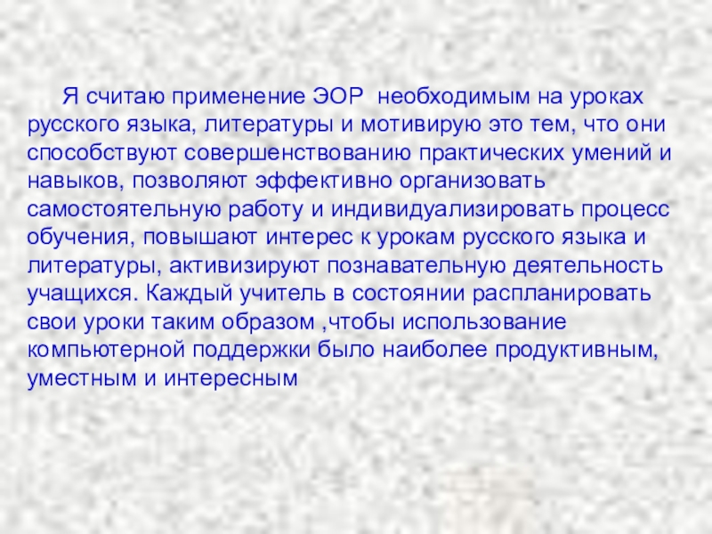 необходимым на уроках русского языка, литературы и мотивирую это тем, что они способствуют совершенствованию практических умений и навыков, позволяют эффективно организовать самостоятельную работу и индивидуализировать процесс обучения, повышают интерес к урокам русского языка и литературы, активизируют познавательную деятельность учащихся. Каждый учитель в состоянии распланировать свои уроки таким образом ,чтобы использование компьютерной поддержки было наиболее продуктивным, уместным и интересным