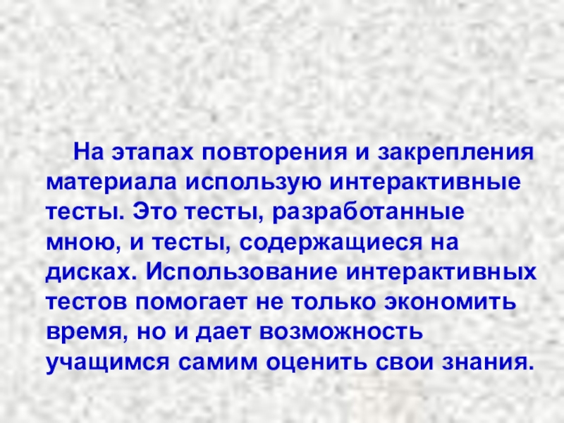 интерактивные тесты. Это тесты, разработанные мною, и тесты, содержащиеся на дисках. Использование интерактивных тестов помогает не только экономить время, но и дает возможность учащимся самим оценить свои знания.