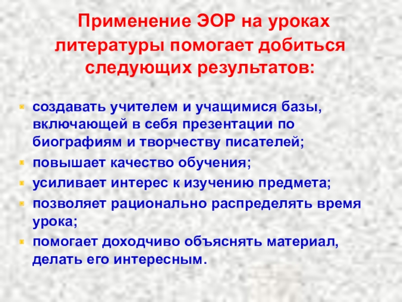 Слайд 23 Применение ЭОР на уроках литературы помогает добиться следующих результатов: