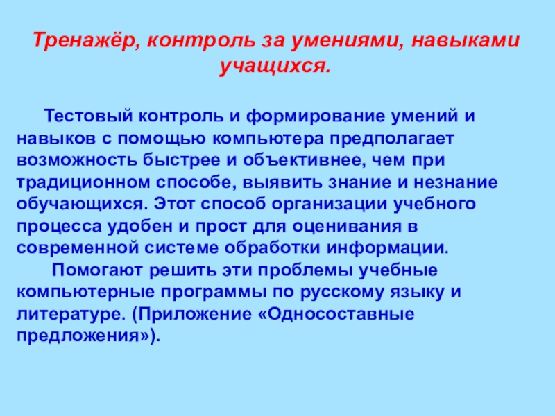 навыков с помощью компьютера предполагает возможность быстрее и объективнее, чем при традиционном способе, выявить знание и незнание обучающихся. Этот способ организации учебного процесса удобен и прост для оценивания в современной системе обработки информации.