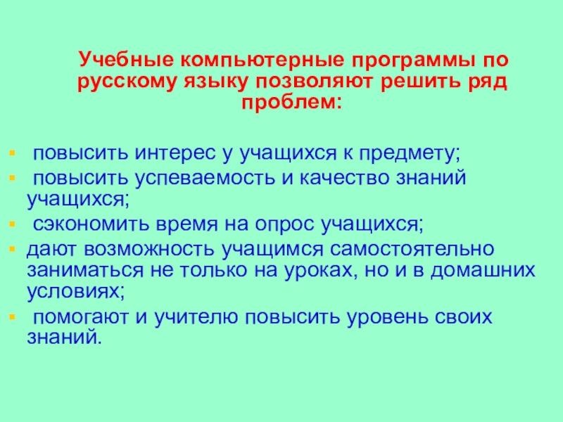 Слайд 19 Учебные компьютерные программы по русскому языку позволяют решить ряд