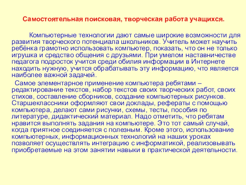 Компьютерные технологии дают самые широкие возможности для развития творческого потенциала школьников. Учитель может научить ребёнка грамотно использовать компьютер, показать, что он не только игрушка и средство общения с друзьями. При умелом наставничестве педагога подросток учится среди обилия информации в Интернете находить нужную, учится обрабатывать эту информацию, что является наиболее важной задачей.