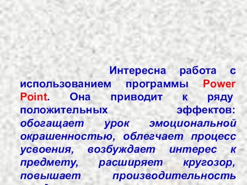 Она приводит к ряду положительных эффектов: обогащает урок эмоциональной окрашенностью, облегчает процесс усвоения, возбуждает интерес к предмету, расширяет кругозор, повышает производительность труда учителя и учащихся на уроке.