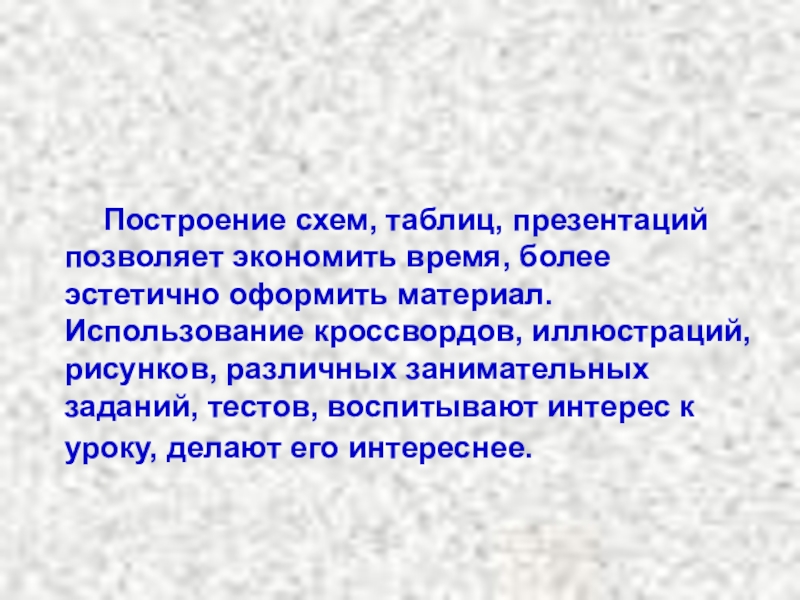 более эстетично оформить материал. Использование кроссвордов, иллюстраций, рисунков, различных занимательных заданий, тестов, воспитывают интерес к уроку, делают его интереснее.