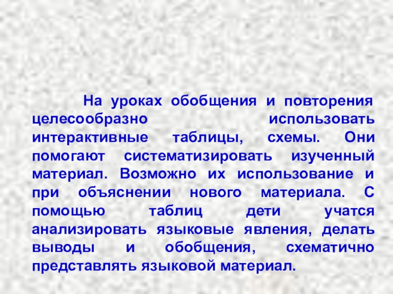 интерактивные таблицы, схемы. Они помогают систематизировать изученный материал. Возможно их использование и при объяснении нового материала. С помощью таблиц дети учатся анализировать языковые явления, делать выводы и обобщения, схематично представлять языковой материал.