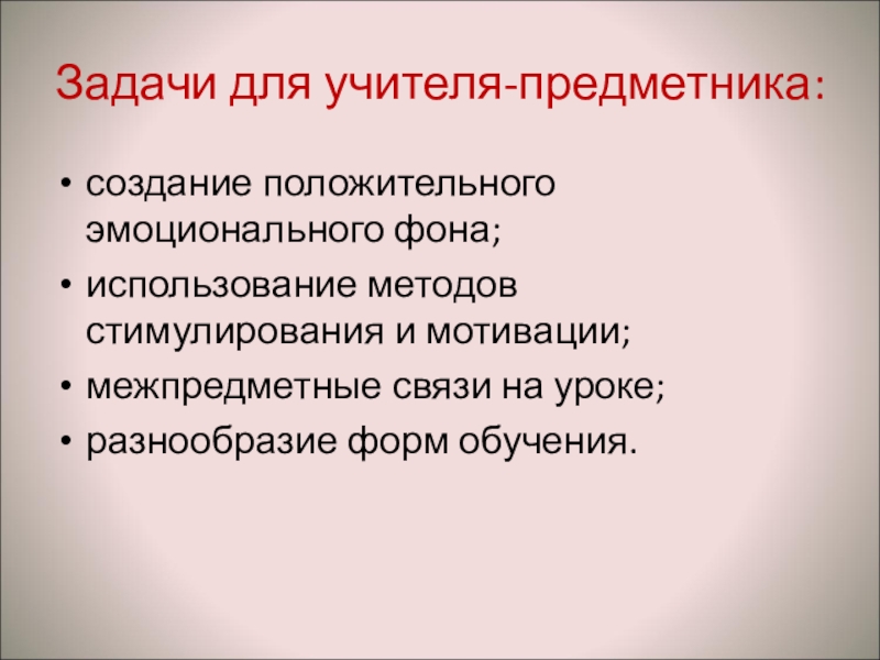 Задачи для учителя-предметника:создание положительного эмоционального фона;использование методов стимулирования и мотивации;межпредметные связи на уроке;разнообразие форм обучения.