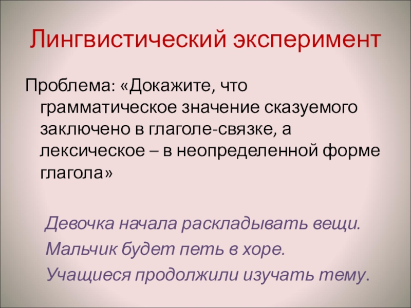 Лингвистический эксперимент Проблема: «Докажите, что грамматическое значение сказуемого заключено в глаголе-связке, а лексическое – в неопределенной форме