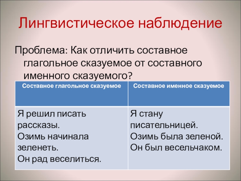 Лингвистическое наблюдениеПроблема: Как отличить составное глагольное сказуемое от составного именного сказуемого?