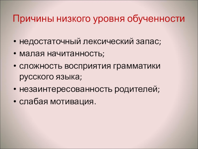Причины низкого уровня обученностинедостаточный лексический запас;малая начитанность;сложность восприятия грамматики русского языка;незаинтересованность родителей;слабая мотивация.