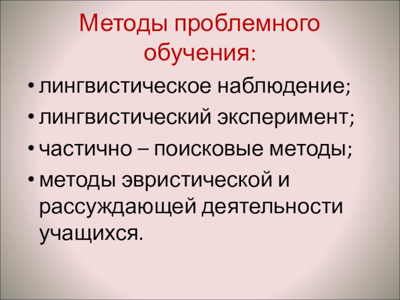 Методы проблемного обучения:лингвистическое наблюдение;лингвистический эксперимент;частично – поисковые методы;методы эвристической и рассуждающей деятельности учащихся.