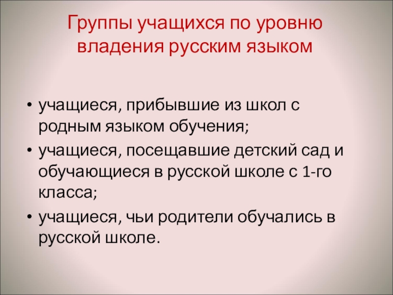 Группы учащихся по уровню владения русским языкомучащиеся, прибывшие из школ с родным языком обучения;учащиеся, посещавшие детский сад