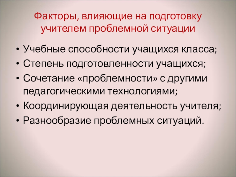 Факторы, влияющие на подготовку учителем проблемной ситуацииУчебные способности учащихся класса;Степень подготовленности учащихся;Сочетание «проблемности» с другими педагогическими технологиями;Координирующая