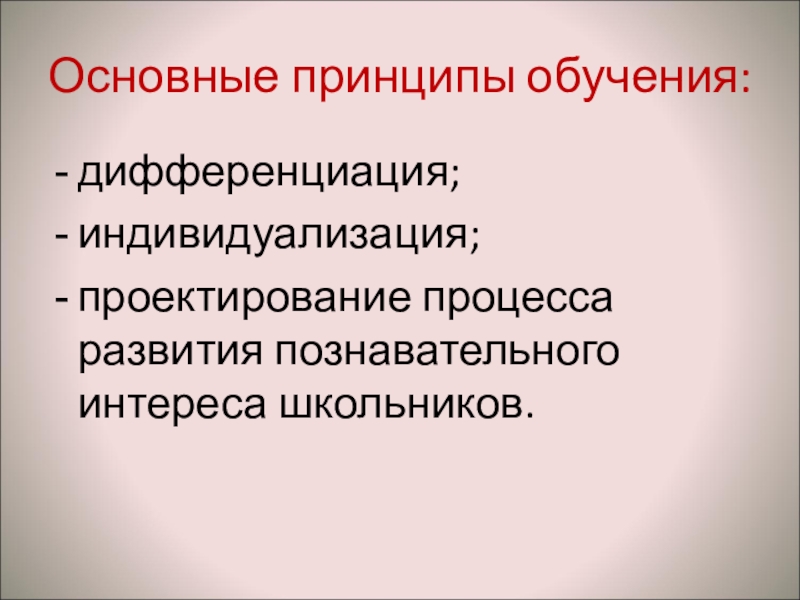 Основные принципы обучения:дифференциация;индивидуализация;проектирование процесса развития познавательного интереса школьников.