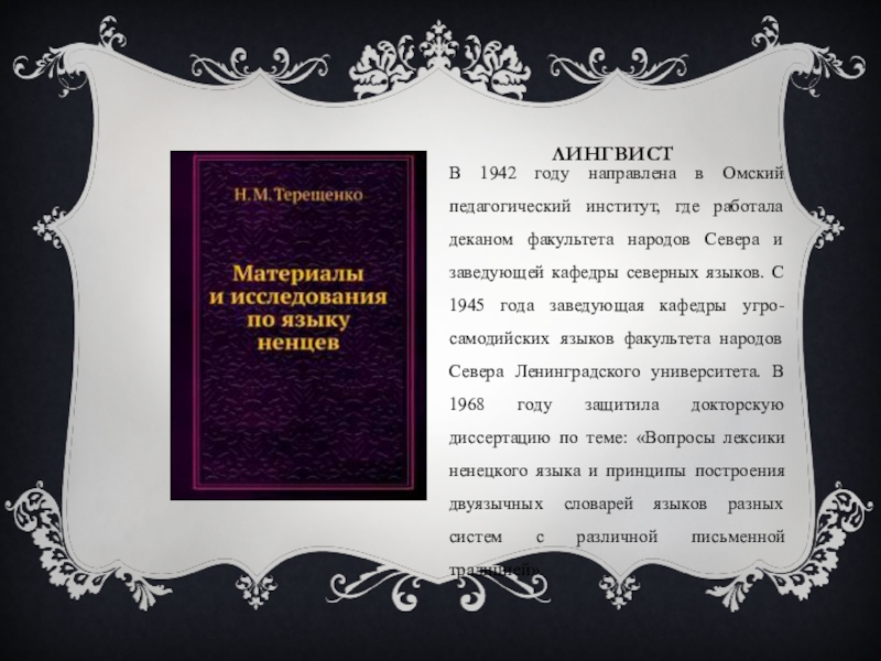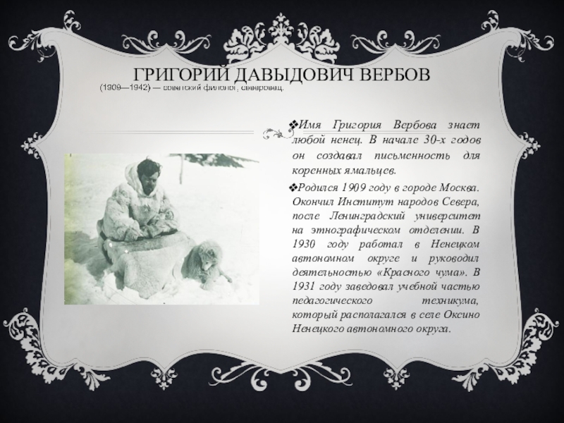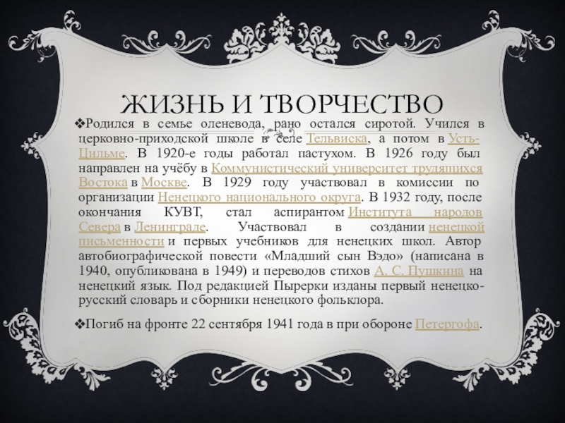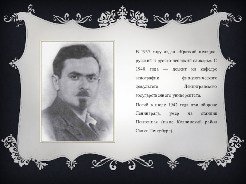 Слайд 7В 1937 году издал «Краткий ненэцко-русский и русско-ненэцкий словарь». С 1940